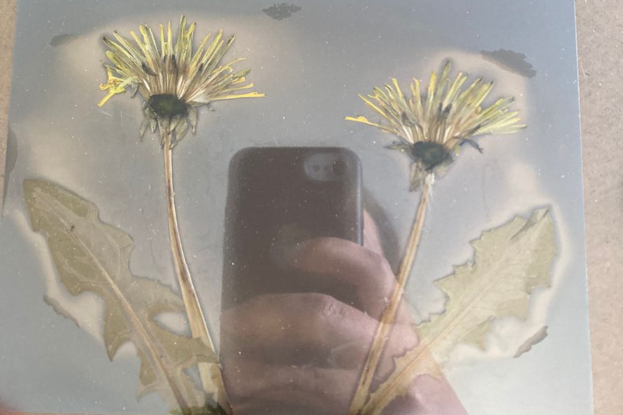 Bei so „saftigen“ Pflanzen wie Löwenzahn drücke ich das Glas auch gerne mal kräftig an, weil die chemische Reaktion mit dem Saft auf dem Fotopapier auch nochmal eine spannende Ebene dazubringt. Hier habe ich einen Löwenzahnstängel mitsamt Blüte mit dem Skalpell halbiert, so dass direkt Saft aufs Papier kam.