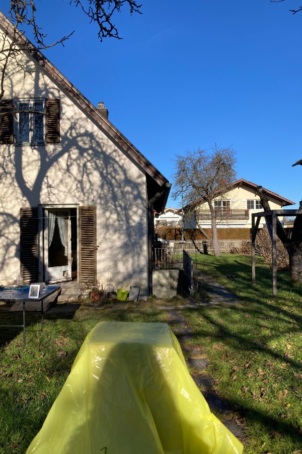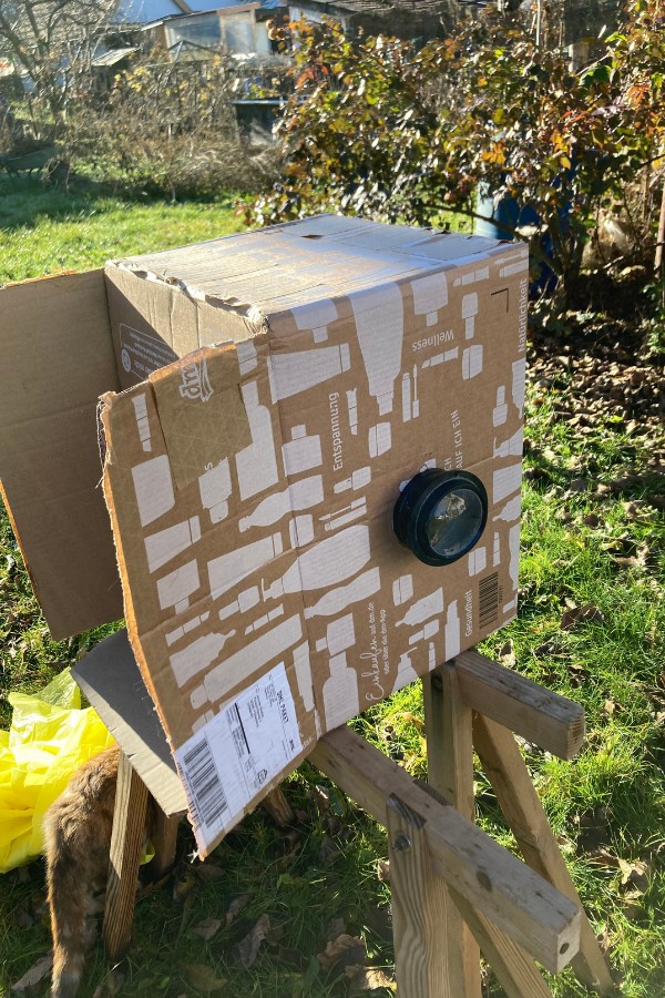 Der Blick geht nach Norden. Nicht aus ästhetischen Gründen, sondern aus Vorsicht: Die Kiste soll mindestens zwei Tage stehen bleiben und darf keine direkte Sonne sehen. Denn Pappe oder Papier im Brennpunkt einer Linse ist grundlegend riskant. (Ich habe tatsächlich schon mehr als eine Kamera verkohlt…)