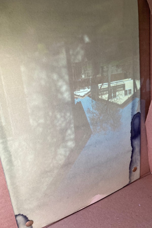 Nach drei Tagen Belichtung mit einem bunten Mix aus Sonne, Wolken und Nebel hatte ich schon auf ein deutliches Bild gehofft. Und die latente Cyanotypie hat auch eindeutige Lichtspuren gezeigt, aber sehr unscharf. bei genauerer Betrachtung konnte ich auch schnell sehen warum: die Linse war im Inneren des Kartons beschlagen und eingefroren. Scharfe Abbildung war so natürlich nicht mehr möglich.