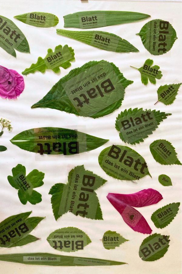 Letzten Sommer habe ich deswegen mit meiner Schüler-AG eine Blättersammelaktion gestartet. Wir haben rund um die Schule etwa fünfzig verschiedene Laubblätter gesammelt und mit Schablonen versehen.